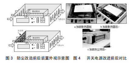 3.2在裝置本體進風孔加防塵網(wǎng),防止灰塵進入裝置內(nèi)部,設(shè)備維護人員定期對濾網(wǎng)進行清掃,從而減輕元器件表面覆塵,利于裝置正常散熱,如圖3所示加裝防塵網(wǎng)后開關(guān)電源示意圖。對裝置實施上述改進后,其改進前后對比如圖4所示。
