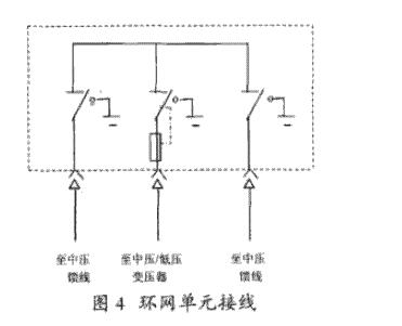 圖4給出了一個(gè)最簡(jiǎn)略的全封閉環(huán)網(wǎng)箱的接線圖。中壓饋線的進(jìn)線裝有負(fù)荷阻隔開(kāi)關(guān),通過(guò)一個(gè)串接限流熔斷器的負(fù)荷開(kāi)關(guān)把變壓器接到環(huán)網(wǎng)體系上,既保護(hù)到變壓器的故障,又能阻隔故障變壓器,使環(huán)網(wǎng)不致斷開(kāi)。現(xiàn)在運(yùn)用的柜環(huán)網(wǎng)都是在根本接線單元的基礎(chǔ)上改善、擴(kuò)展而成的。