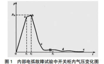 壓縮階段。0~t1時間內(nèi),柜體內(nèi)部產(chǎn)生電弧到泄壓裝置通道口排出。設在t=0時柜體內(nèi)部出現(xiàn)強大功率電弧,故障室內(nèi)的壓力上升很快。內(nèi)部故障電流越大,電弧電壓越高,隔內(nèi)體積越小,則壓力上升越快。直到排氣口打開,這一階段才結束,持續(xù)的時間大約為5~10ms。