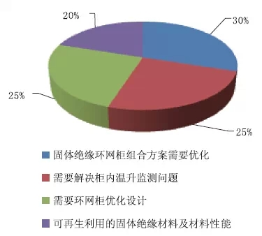 在固體絕緣環(huán)網(wǎng)柜規(guī)劃中,認(rèn)為亟待處理的問題具體有以下內(nèi)容,認(rèn)為固體絕緣環(huán)網(wǎng)柜組合方案需求優(yōu)化的占比30%;需求處理柜內(nèi)溫升監(jiān)測(cè)問題的占比25%;需求環(huán)網(wǎng)柜優(yōu)化規(guī)劃的占比25%;可再生利用的固體絕緣材料及材料功用的占比20%。如圖10所示。