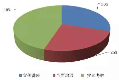 經(jīng)過了解參與者了解新產(chǎn)品知識(shí)的途徑,認(rèn)為最有用的辦法中:宣揚(yáng)講座的占比30%;可以經(jīng)過當(dāng)面交流的占比25%;可以參與實(shí)地考察的占比45%。如圖16所示。