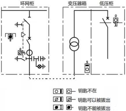 如圖7所示,環(huán)網(wǎng)箱內部,阻隔/接地開關與電纜室門之間的鑰匙聯(lián)鎖,電纜室蓋板翻開后,鑰匙被確定,不能拔出刺進到阻隔開關鎖,即不能操作接地開關;只需蓋板合上,鑰匙才華拔出,去操作接地開關分閘。而體系視點,只需接地開關合閘,鑰匙才華被取出,去開變壓器箱的門,結束變壓器檢修,一同低壓斷路器不能合閘。
