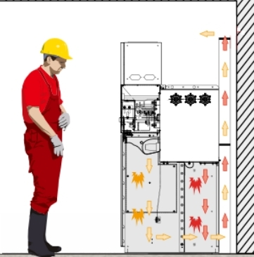 壓力通過后部通道上部開釋出來,氣流出來后沿著箱頂部走,氣流已通過長間隔的活動,燃燒火焰及沖擊力已明顯減小,對設備和人員的損害較小,避免開釋到電纜溝對電纜的損壞,或氣箱電弧壓力直接從頂部開釋到開關(guān)室頂部反彈,直接損害柜前人員,或反彈進一步燒損其它設備。