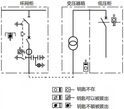 如圖7所示,環(huán)網(wǎng)箱內(nèi)部,隔絕/接地開關(guān)與電纜室門之間的鑰匙聯(lián)鎖,電纜室蓋板翻開后,鑰匙被必定,不能拔出刺進到隔絕開關(guān)鎖,即不能操作接地開關(guān);只需蓋板合上,鑰匙才華拔出,去操作接地開關(guān)分閘。而體系角度,只需接地開關(guān)合閘,鑰匙才華被取出,去開變壓器箱的門,結(jié)束變壓器檢修,一起低壓斷路器不能合閘。