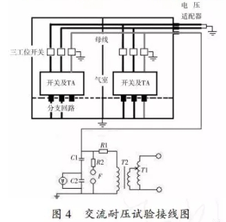 根據(jù)文獻(xiàn)關(guān)于高壓開關(guān)柜、電壓互感器、電流互感器、避雷器等章節(jié)要求,充氣柜的實(shí)驗(yàn)項(xiàng)目應(yīng)包含斷路器、電壓互感器、電流互感器、避雷器等元件的例行實(shí)驗(yàn)項(xiàng)目,考慮到充氣柜結(jié)構(gòu)的特殊性和現(xiàn)場(chǎng)運(yùn)用的實(shí)用性,選取了交流耐壓試
