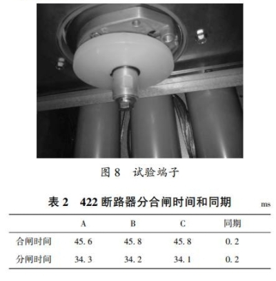 本次實(shí)驗(yàn)選取422斷路器進(jìn)行機(jī)械特性查驗(yàn),按圖6進(jìn)行實(shí)驗(yàn)接線。將4221阻隔開關(guān)置于接地方位,將實(shí)驗(yàn)端子接到柜內(nèi)電纜接口,然后將實(shí)驗(yàn)線接到實(shí)驗(yàn)端子下端進(jìn)行實(shí)驗(yàn)。實(shí)驗(yàn)端子如圖8所示。422斷路器分合閘時(shí)間和同期見表2。